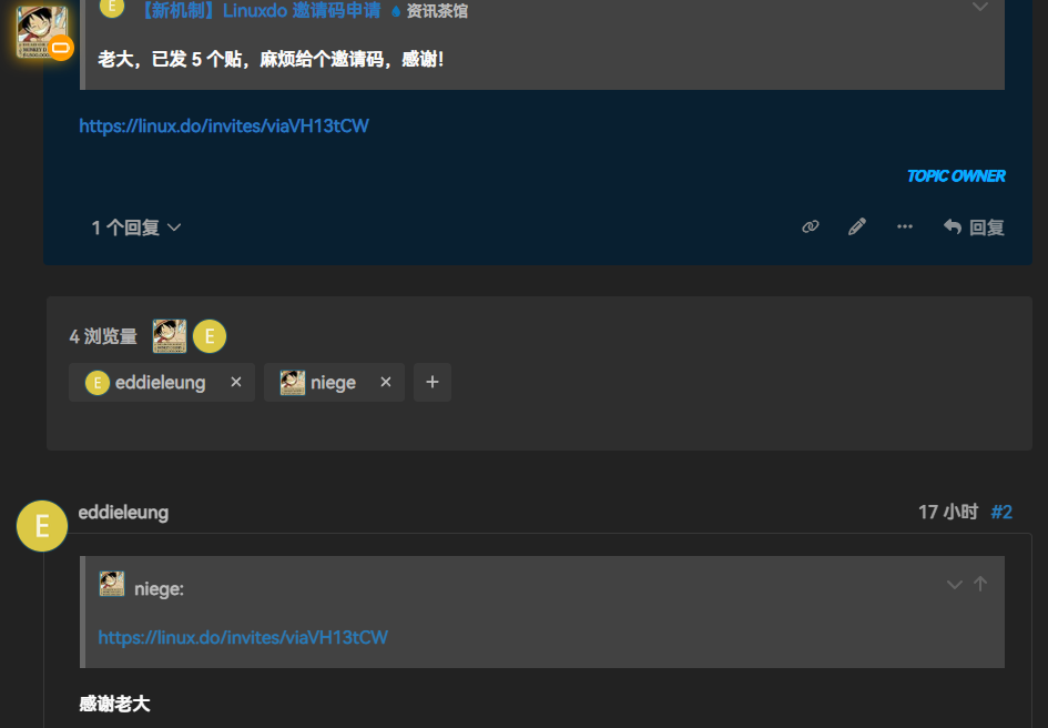 [!question]为了不浪费每天的邀请码名额,如果当天下午4点前没人完成转帖任务,或者活跃度都不够的话,我会随机找一个当天回帖中的有眼缘的用户发放,发放记录会列在下面。