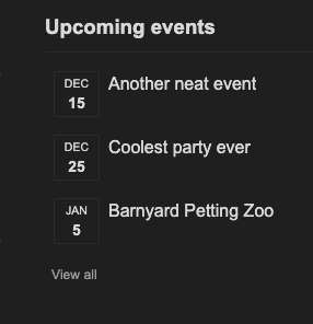 | sidebar show upcoming events | 在侧边栏中的“更多”下显示即将发生的活动链接。需要启用 post event enabled 。 |