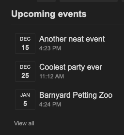 不出所料,Discourse 日历(和事件) 为您的 Discourse 网站添加了日历和事件功能。有了这些,您可以创建单独的主题日历来跟踪重要场合或时间线,按类别显示日历,添加假期日历以标记假期、缺勤或病假,创建交互式事件主题,以及显示所有即将发生的事件的易于访问的日历摘要。