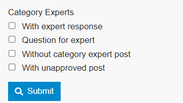 提供专家相关字段的高级搜索筛选器。搜索字段的显示/隐藏根据用户身份动态调整:「含专家回复」对所有用户可见,「专家提问」与「无专家帖子」仅对专家可见,「含未批准帖子」仅对工作人员可见。